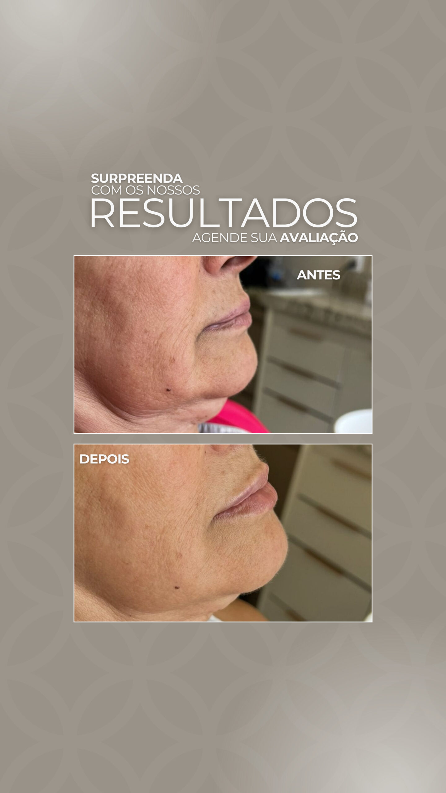 Acúmulo de gordura ou perda de estrutura óssea → contorno indefinido e rosto “sem força” → impacto na harmonia facial e na sensação de firmeza.